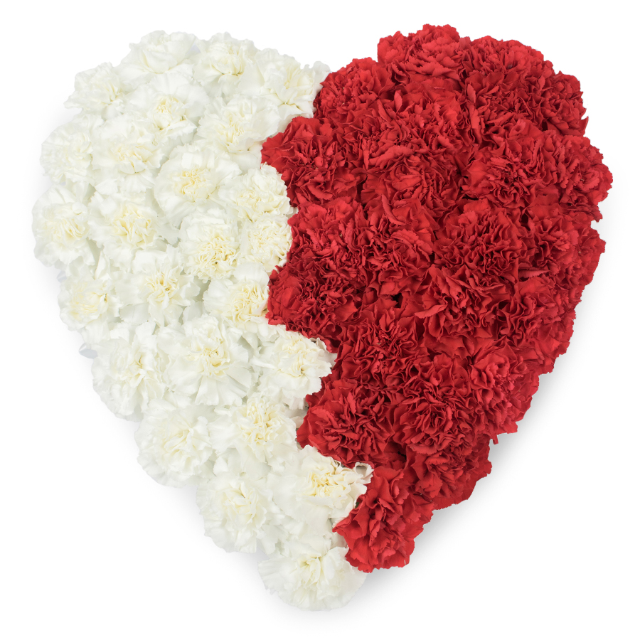 Express your thoughtfulness and love with the Heart Formation Carnation Bouquet by Handy Flowers. This exquisite arrangement features a perfect blend of white and red carnations, artistically arranged into a heart shape.